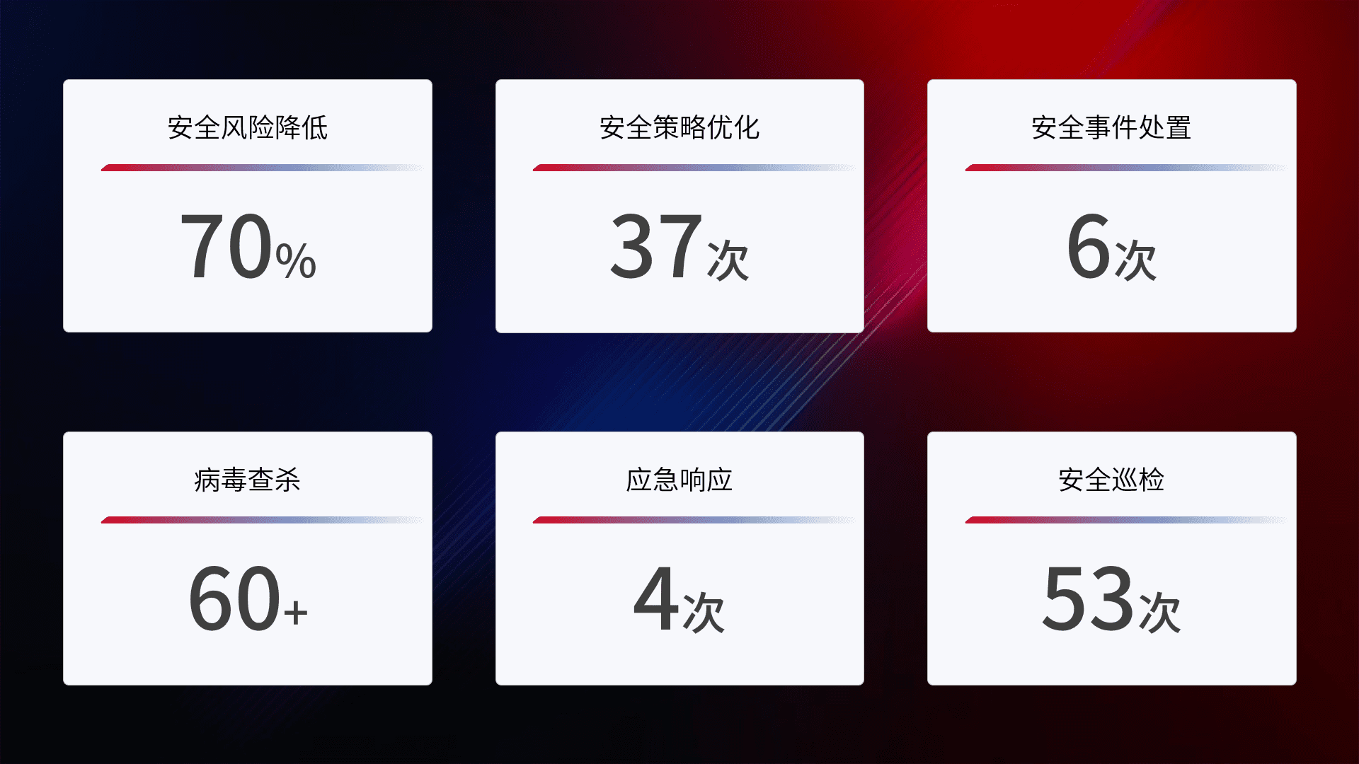 提供全面的安全事件报告体系,,,包括处置报告、、、、周报、、、季度和年度总结,,结合持续监控,,帮助客户深入了解网络安全状况。。。